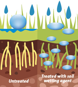 Soil wetting agents are designed to help soils absorb more water and eliminate runoff of rain or irrigation water. Specially formulated to reduce surface tension and contact angle of water, soil wetting agents allow water to penetrate more quickly, deeply and widely across the root zone.